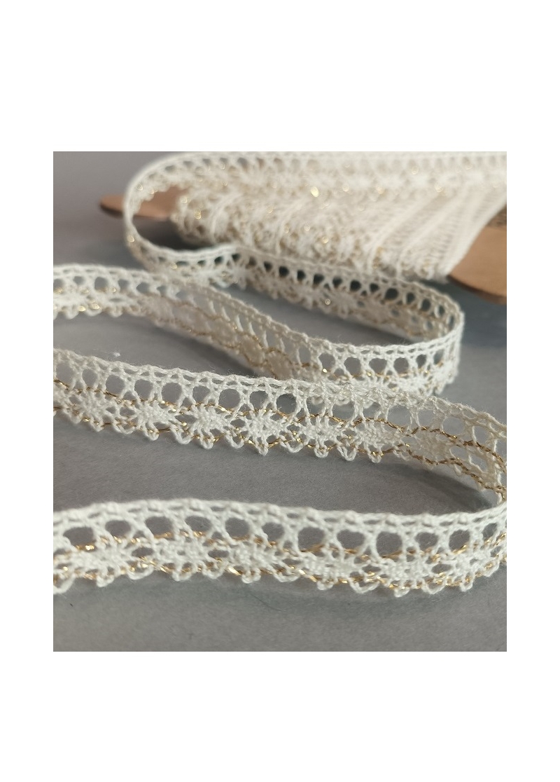 Beżowa koronka bawełniana z wplecioną złotą nitką, o szerokości 12mm.