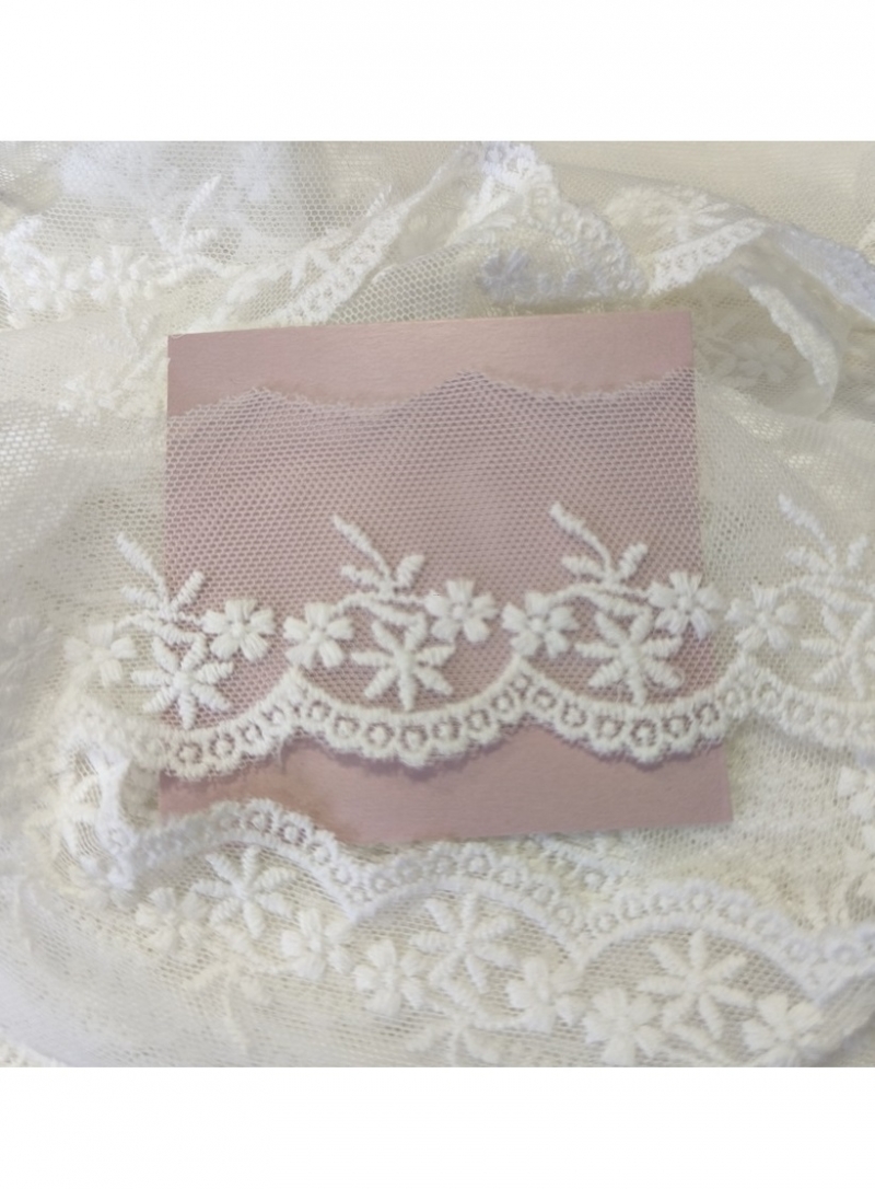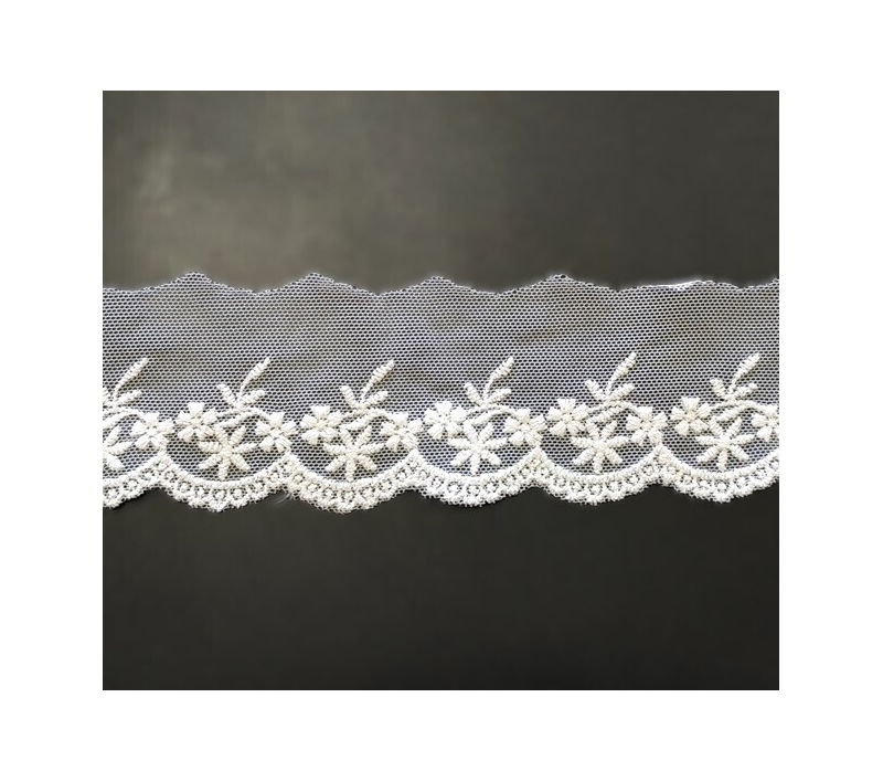 Bawełniany haft na tiulu w kolorze off white (śmietankowy). Szerokość w najszerszym miejscu- 40mm.