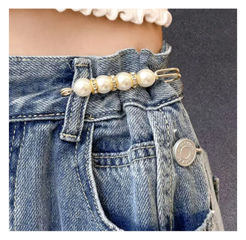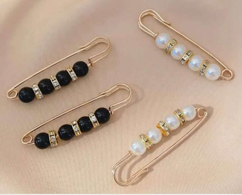 Ozdobna złota agrafka, ozdobiona perełkami i cyrkoniami.