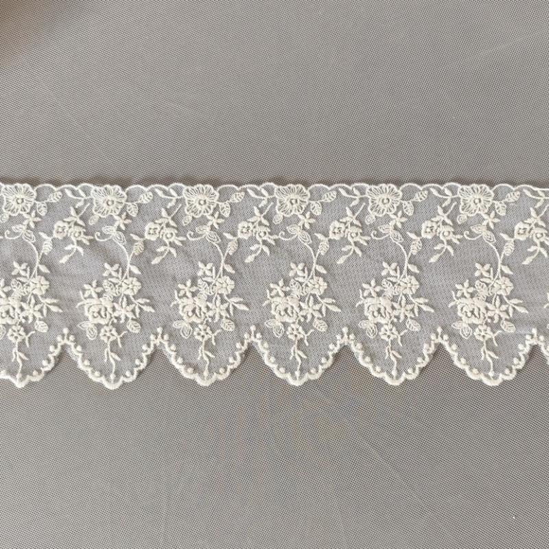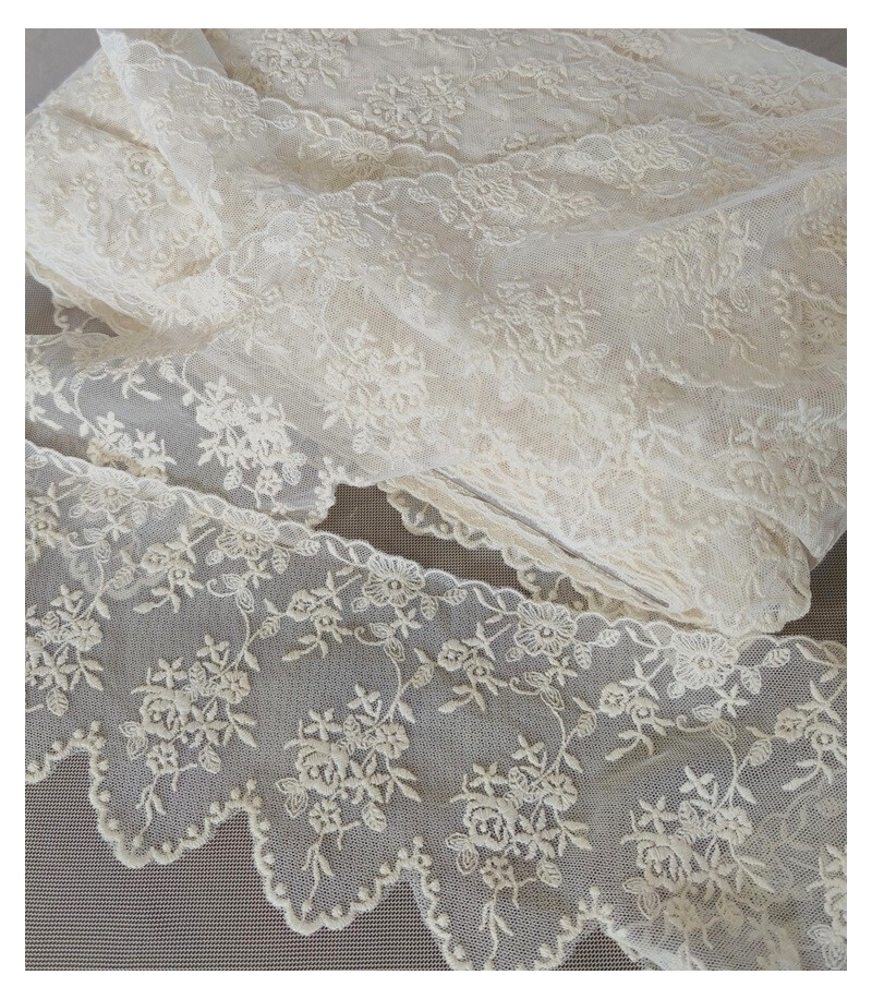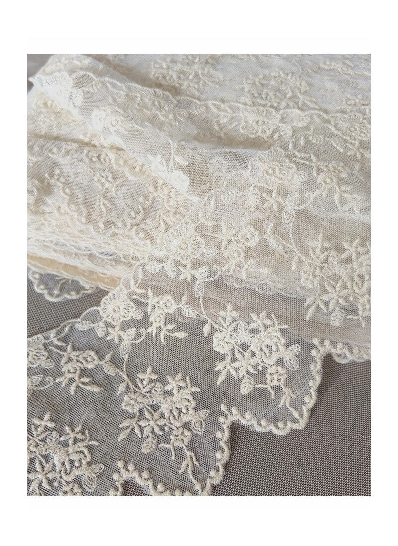 Bawełniany haft na tiulu w kolorze beżowym (nie jest to kolor śmietankowy!). Szerokość w najszerszym miejscu- 11cm.