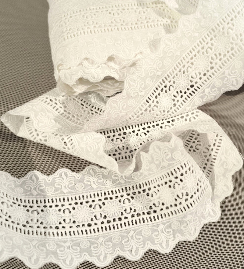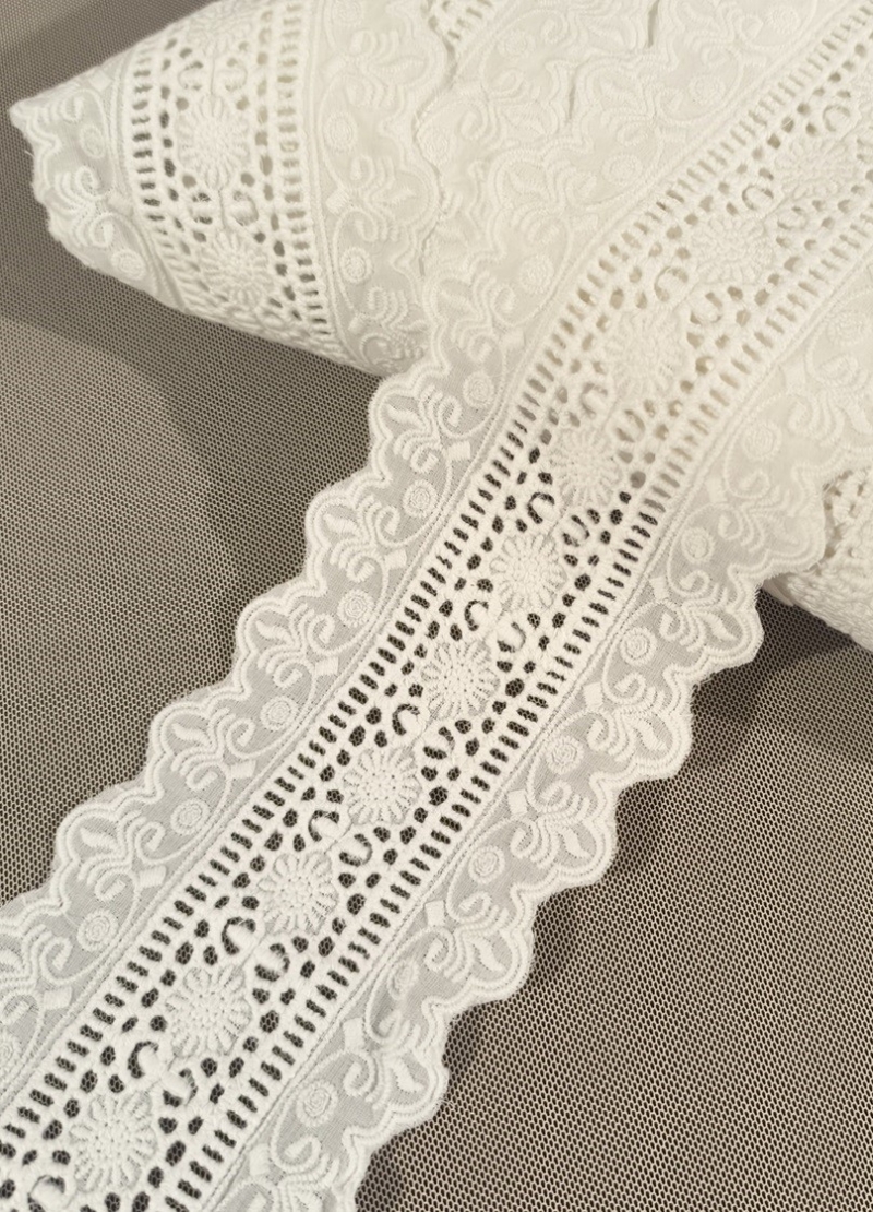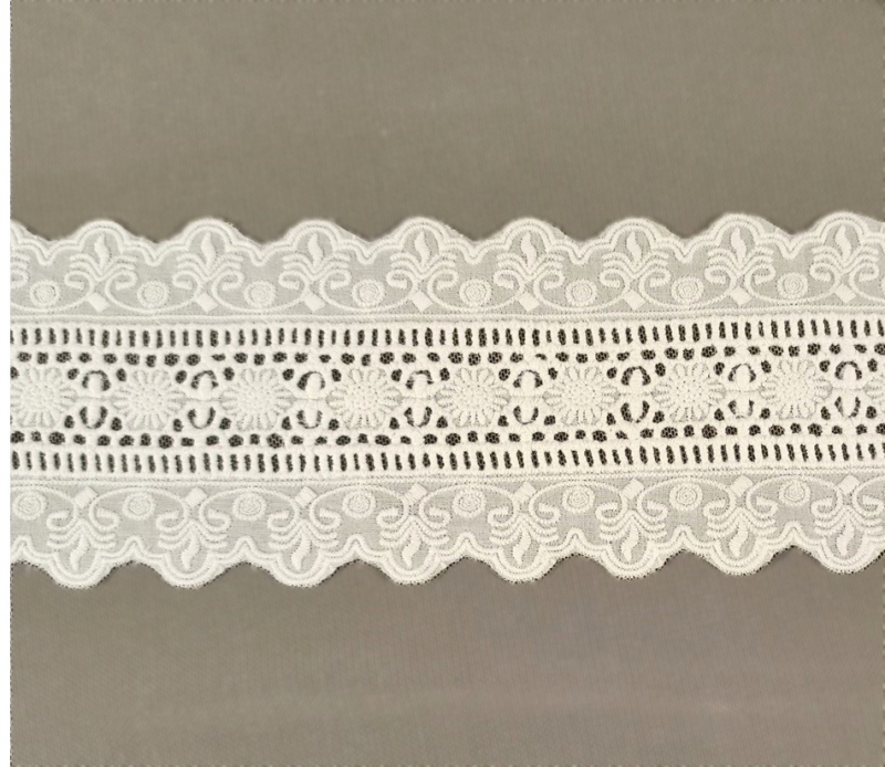 Bawełniany haft na tkaninie bawełnianej w kolorze śmietankowym ("złamana biel") Całość w 100% z bawełny.  Doskonałej jakości, gruby wzór . Szerokość całkowita 9cm